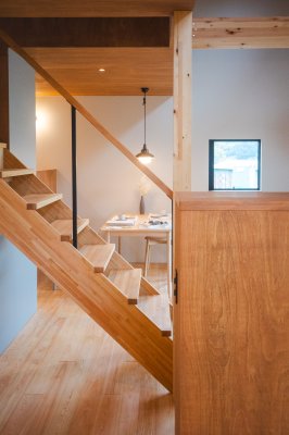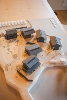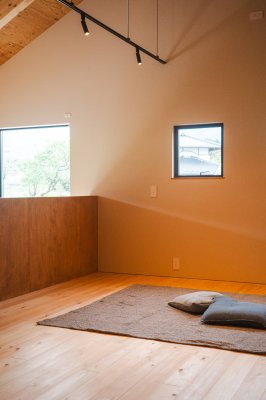 ■全体:起伏を生かした地形2700㎡の敷地に全5戸の分譲住宅。同じ敷地内に店舗棟(1Fハンバーガー、点心を提供する『BAOBAO』、2F1日1組限定の宿泊施設『SUISUI』)を建設。共用の広場や畑などのコモンスペースも取入れています。 ■建物:TYPE-ATとTYPE-Bの2種類が有りますが、今回はTYPE-Aのご紹介になります。 大きな軒下空間を取入れ、間仕切りを設けないリビング・ダイニングと一部を吹抜け構造にした解放感。上階には寝室に加え、お子様のプライバシーに配慮した個室も備えています。 |