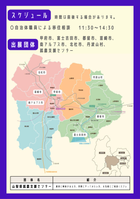 | 概要 | 開催日時:2026年2月22日 (日) 11:30 - 14:30(途中参加・退出自由です) 参加費:無料 【参加団体】 甲府市、富士吉田市、都留市、韮崎市、南アルプス市、北杜市、丹波山村、就農支援センター(8団体) |